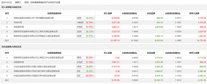具体来看,机构买入4871.38万元,卖出393.33万元,合计净买入4478.06万元。此外,招商证券广州华穗路证券营业部、深股通专用分别买入6018.89万元、3961.31万元;国泰君安证券上海松江中山东路证券营业部、深股通专用分别卖出3714.01万元、3675.98万元。