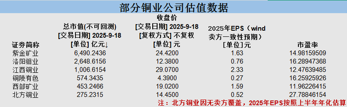 而机构覆盖力度更大的其他头部铜业公司,采用Wind卖方一致盈利预测结果与最新价计算的最新市盈率,普遍保持在17倍以下。