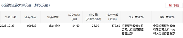 北方铜业今日大宗交易折价成交26万股,成交额379.6万元