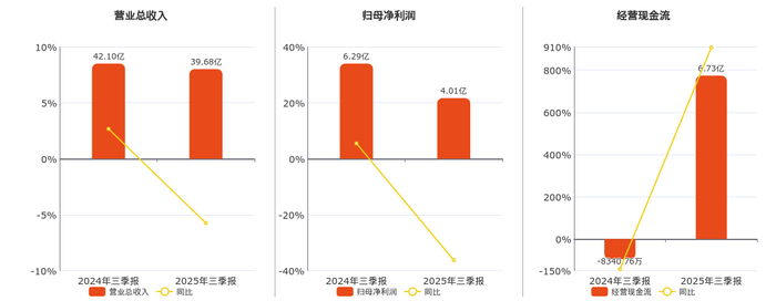 公司营业总收入为39.68亿元,较去年同报告期营业总收入减少2.42亿元,同比较去年同期下降5.75%。归母净利润为4.01亿元,较去年同报告期归母净利润减少2.28亿元,同比较去年同期下降36.25%。经营活动现金净流入为6.73亿元,较去年同报告期经营活动现金净流入增加7.57亿元。