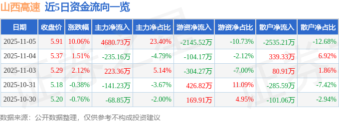 证券之星消息,山西高速11月5日涨停收盘,收盘价5.91元。该股于9点53分涨停,2次打开涨停,截止收盘封单资金为1267.36万元,占其流通市值0.15%。
