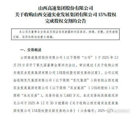 2025年12月29日,山西高速召开董事会会议,审议通过以7480万元现金收购苏汽集团有限公司(以下简称“苏汽集团”)持有的山西交通实业发展集团有限公司(以下简称“实业集团”)15%股权的议案。
