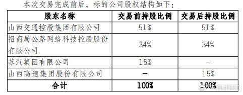 股权结构上,交易前,实业集团由山西交控集团持股51%;招商公路持股34%;苏汽集团持股比例15%。