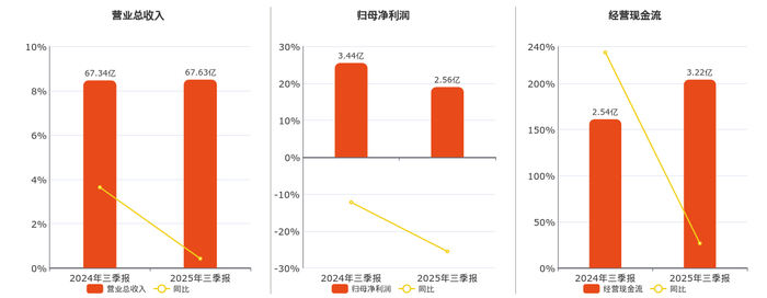 公司营业总收入为67.63亿元,较去年同报告期营业总收入增加2845.47万元,实现5年连续上涨,同比较去年同期上涨0.42%。归母净利润为2.56亿元,较去年同报告期归母净利润减少8785.92万元,同比较去年同期下降25.53%。经营活动现金净流入为3.22亿元,较去年同报告期经营活动现金净流入增加6775.82万元,实现2年连续上涨,同比较去年同期上涨26.65%。