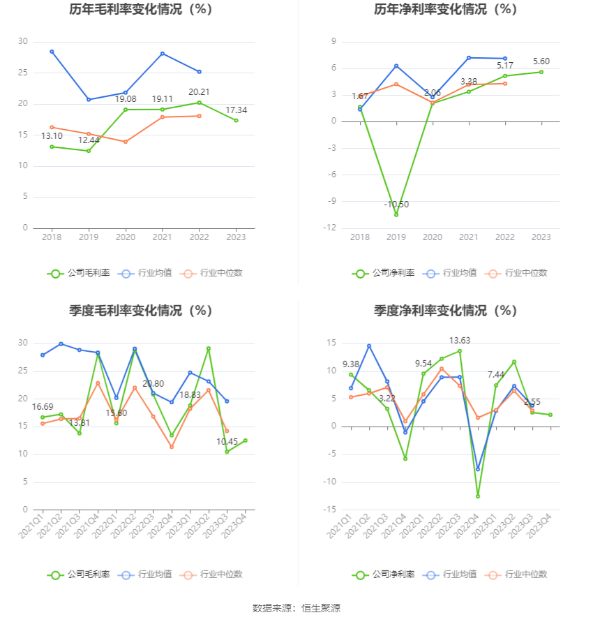 2023年,公司毛利率为17.34%,同比下降2.87个百分点;净利率为5.60%,较上年同期上升0.43个百分点。从单季度指标来看,2023年第四季度公司毛利率为12.51%,同比下降0.93个百分点,环比上升2.06个百分点;净利率为2.13%,较上年同期上升14.70个百分点,较上一季度下降0.42个百分点。