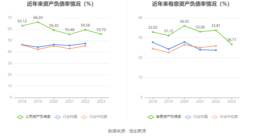 在偿债能力方面,公司2023年年末资产负债率为55.70%,相比上年末下降3.88个百分点;有息资产负债率为26.71%,相比上年末下降7.10个百分点。