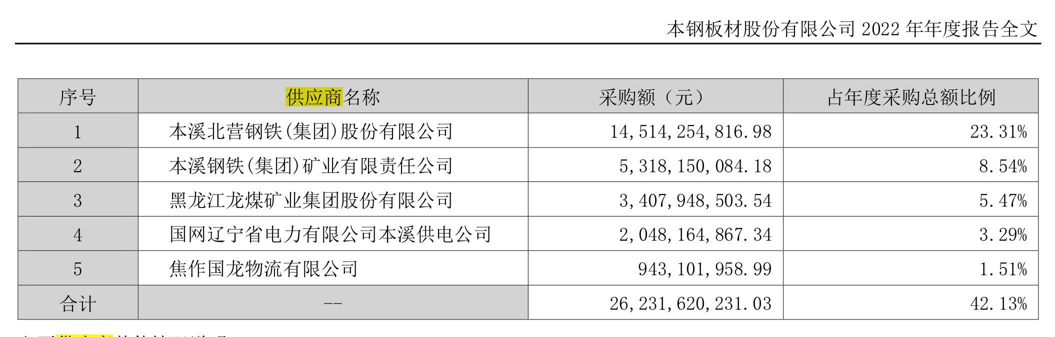 来源:公告值得注意的是,本溪矿业常年为本钢板材的前五供应商之一。比如2022年年报显示,本溪矿业为第二大供应商,采购额53.18亿元,占年度采购总额比例为8.54%;2021年,本溪矿业同样为本钢板材的第二大供应商,涉及采购额79.37亿元,占总额比例11.04%;2020年为第三大供应商,涉及采购额51.86亿元,占比11.18%;2019年为第二供应商,金额46.87亿元,占比9.52%。