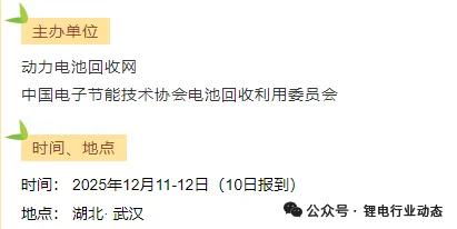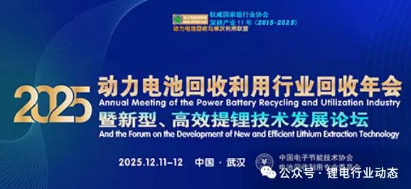 “2025中国动力电池回收利用行业回收年会暨新型、高效提锂技术发展论坛”将于12月11-12日在武汉举办,规模:500+,大会主题:绿色循环·高效提锂。
