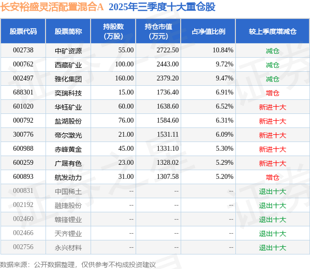 长安裕盛灵活配置混合A的前十大重仓股如下: