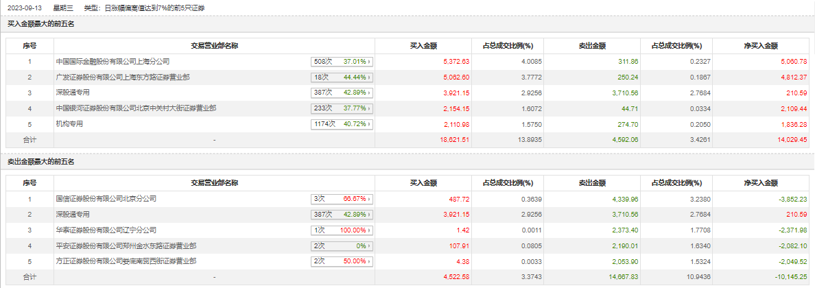 具体来看,机构买入2110.98万元,卖出274.7万元,合计净买入1836.28万元。此外,中国国际金融上海分公司、广发证券上海东方路证券营业部分别买入5372.63万元、5062.60万元;国信证券北京分公司、深股通专用分别卖出4339.96万元、3710.56万元。