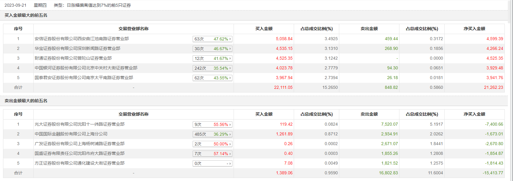 具体来看,知名游资现身龙虎榜,作手新一(国泰君安证券股份有限公司南京太平南路证券营业部)净买入3941.76万元。此外,安信证券西安曲江池南路证券营业部、华宝证券深圳新闻路证券营业部分别买入5058.84万元、4535.15万元;光大证券沈阳十一纬路证券营业部、中国国际金融上海分公司分别卖出7520.07万元、2934.91万元。