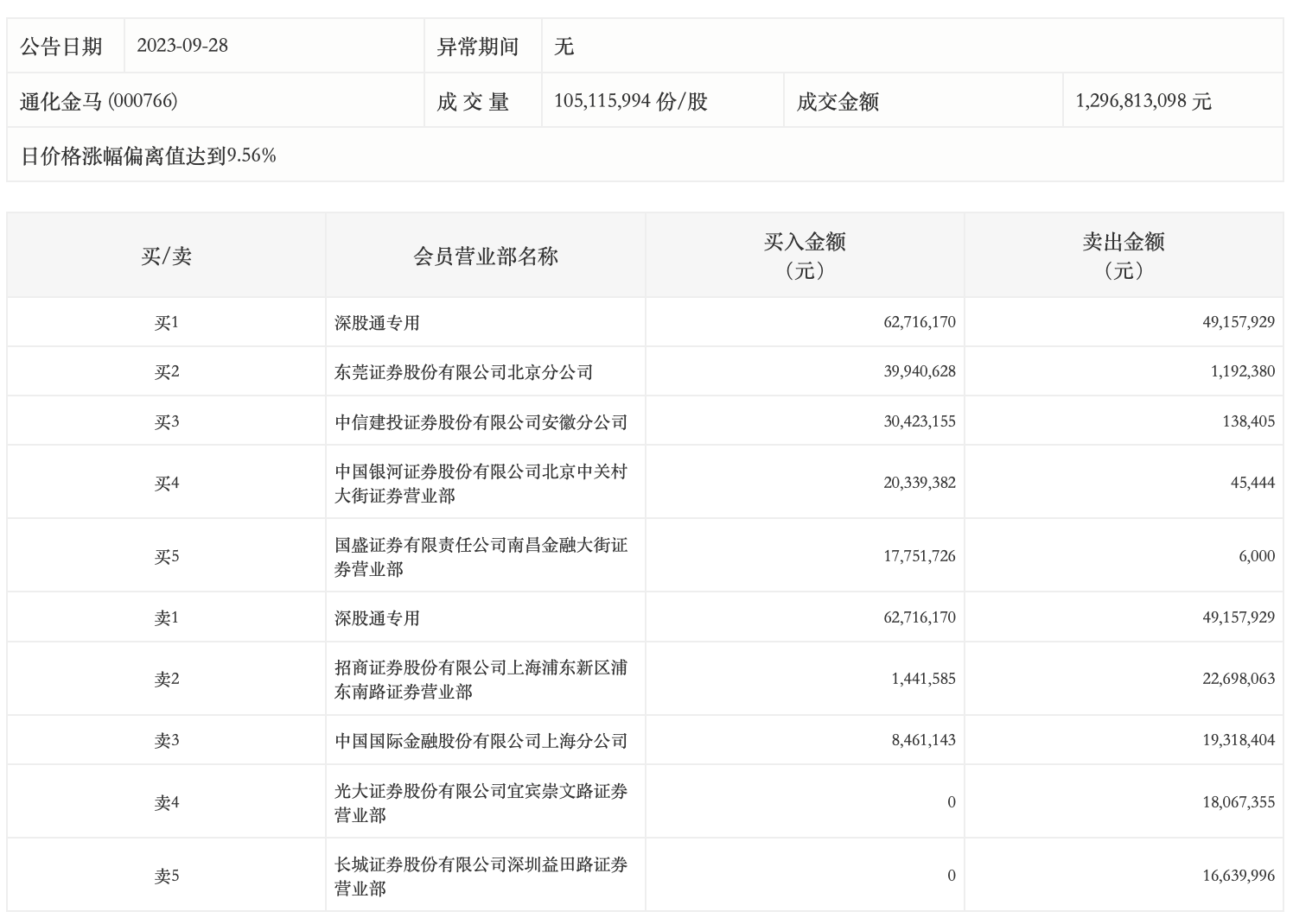 9月28日,通化金马今日涨停,全天换手率达10.88%,振幅达11.22%。龙虎榜数据显示,营业部席位合计净买入5380.98万元。其中,深股通专用、著名刺客(东莞证券北京分公司)分别买入6271.62万元、3994.06万元;深股通专用、招商证券上海浦东新区浦东南路证券营业部分别卖出4915.79万元、2269.81万元。
