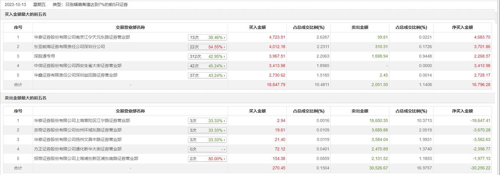 具体来看,知名游资现身龙虎榜,方新侠(中信证券股份有限公司西安朱雀大街证券营业部)净买入3413.98万元。此外,华泰证券南京江宁天元东路证券营业部、东亚前海证券深圳分公司分别买入4723.51万元、4012.18万元;华泰证券上海普陀区江宁路证券营业部、浙商证券台州环城东路证券营业部分别卖出1.87亿元、3689.88万元。