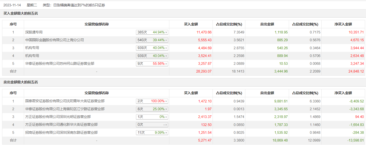 11月14日涨停,成交额15.60亿元,换手率12.00%,盘后龙虎榜数据显示,深股通专用席位买入1.15亿元并卖出1118.95万元,二机构专用席位净买入6578.92万元。