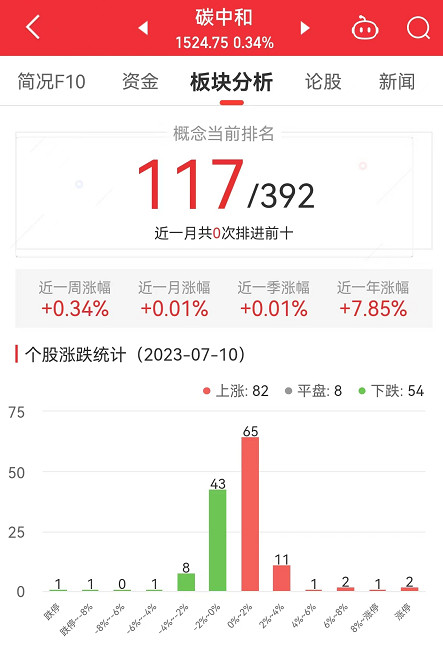 中国经济网北京7月10日讯 今日,碳中和板块整体涨幅0.34%,其中,82只股票上涨,8只股票平盘,54只股票下跌。