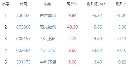 东方国信、曙光数创、*ST正邦、*ST天沃、中科环保位列涨幅榜后五位,涨幅分别为-9.22%、-5.85%、-4.89%、-3.62%、-3.49%。