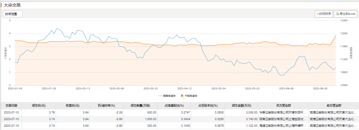 7月10日大宗交易成交2100万股,成交额7870万元,占当日总成交额的6.97%,成交均价3.75元,较市场收盘价3.84元折价2.34%,其中最高成交价3.76元,最低成交价3.74元。
