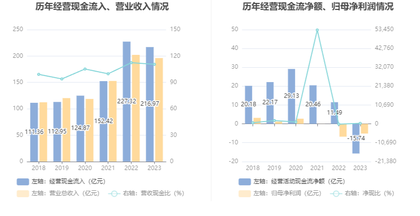 2023年,公司经营活动现金流净额为-15.74亿元,同比减少27.24亿元;筹资活动现金流净额26.17亿元,同比减少18.79亿元;投资活动现金流净额-16.23亿元,上年同期为-19.88亿元。