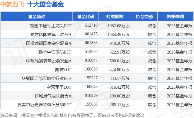 重仓中航西飞的前十大公募基金请见下表: