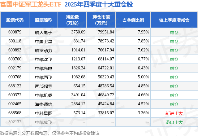 根据2025基金年报公募基金重仓股数据,重仓该股的公募基金共41家,其中持有数量最多的公募基金为富国基金的富国中证军工龙头ETF。富国中证军工龙头ETF目前规模为100.58亿元,最新净值0.9207(3月2日),较上一交易日上涨3.86%,近一年上涨58.5%。该公募基金现任基金经理为王乐乐 牛志冬。王乐乐在任的基金产品包括:富国中证消费50ETF,管理时间为2019年10月14日至今,期间收益率为15.7%;富国中证科技50策略ETF,管理时间为2019年11月15日至今,期间收益率为89.83%;富国中证科技50策略ETF联接A,管理时间为2020年2月20日至今,期间收益率为43.36%。牛志冬在任的基金产品包括:富国中证移动互联网指数(LOF)A,管理时间为2015年5月13日至今,期间收益率为0.75%;富国中证医药主题指数增强A,管理时间为2016年11月11日至今,期间收益率为42.06%;富国中证娱乐主题指数增强(LOF)A,管理时间为2017年3月13日至今,期间收益率为-16.08%;