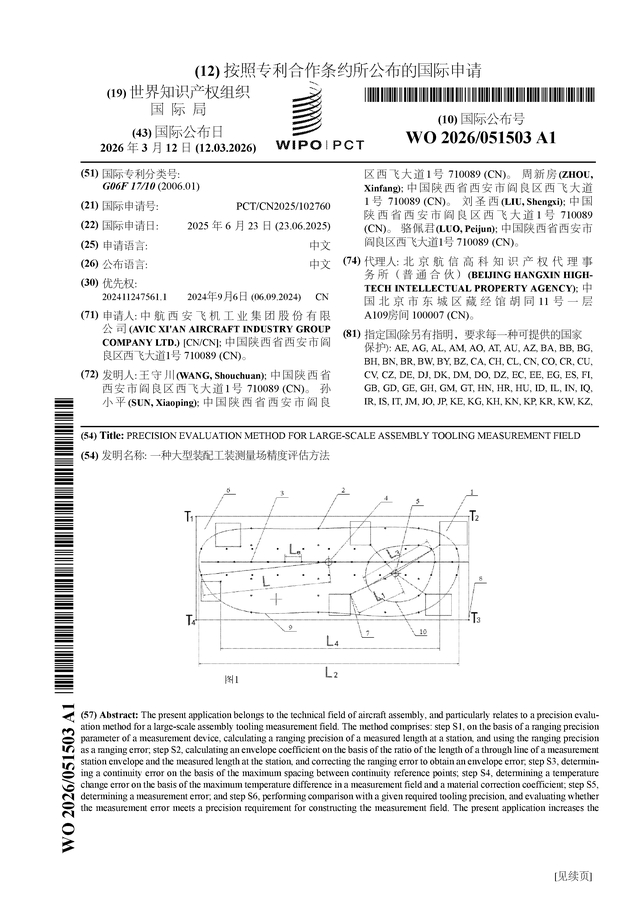 中航西飞公布国际专利申请:“一种大型装配工装测量场精度评估方法”
