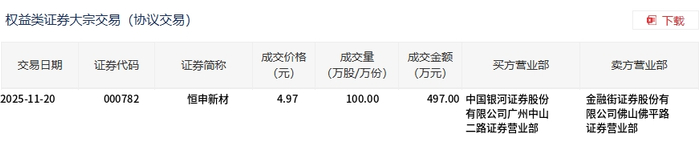 11月20日,恒申新材大宗交易成交100万股,成交额497万元,占当日总成交额的8.15%,成交价4.97元,较市场收盘价5.49元折价9.47%。