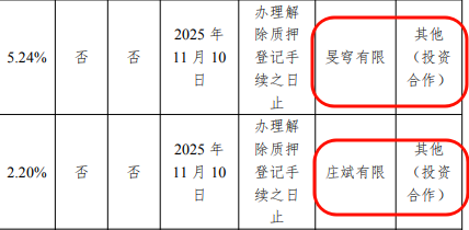 公告显示,两个质押的质权人分别为旻穹有限和庄斌有限