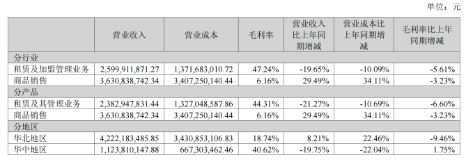 但业务结构的此消彼长却带来了盈利质量的下降。财报显示,商品销售业务的平均毛利率仅为6.16%,低于租赁和加盟管理业务47.24%的毛利率水平。