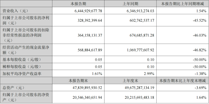 今年上半年,公司实现营业收入64.45亿元,同比增长1.54%;实现归属净利润3.28亿元,同比下降45.52%,扣非净利润3.64亿元,同比下降46.03%。