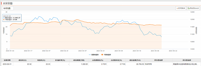 6月1日大宗交易成交1200万股,成交额2.68亿元,占当日总成交额的64.39%,成交价22.33元,较市场收盘价22.33元持平。