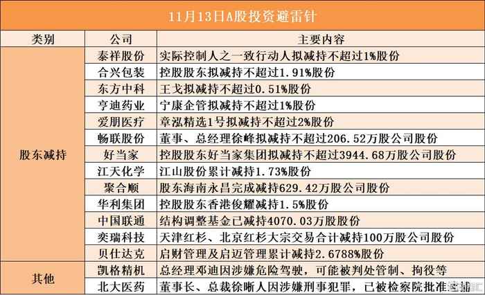 泰祥股份实际控制人之一致行动人拟减持不超过1%股份;合兴包装控股股东拟减持不超过1.91%股份;东方中科股东王戈拟减持不超过0.51%股份;亨迪药业股东宁康企管拟减持不超过1%股份;爱朋医疗股东章泓精选1号拟减持不超过2%股份;畅联股份董事、总经理徐峰拟减持不超过206.52万股公司股份;好当家控股股东好当家集团拟减持不超过3944.68万股公司股份; 奕瑞科技股东天津红杉、北京红杉大宗交易合计减持100万股公司股份;贝仕达克股东启财管理及启迈管理累计减持2.6788%股份;凯格精机总经理邓迪因涉嫌危险驾驶,可能被判处管制、拘役等;北大医药董事长、总裁徐晰人因涉嫌刑事犯罪,已被检察院批准逮捕