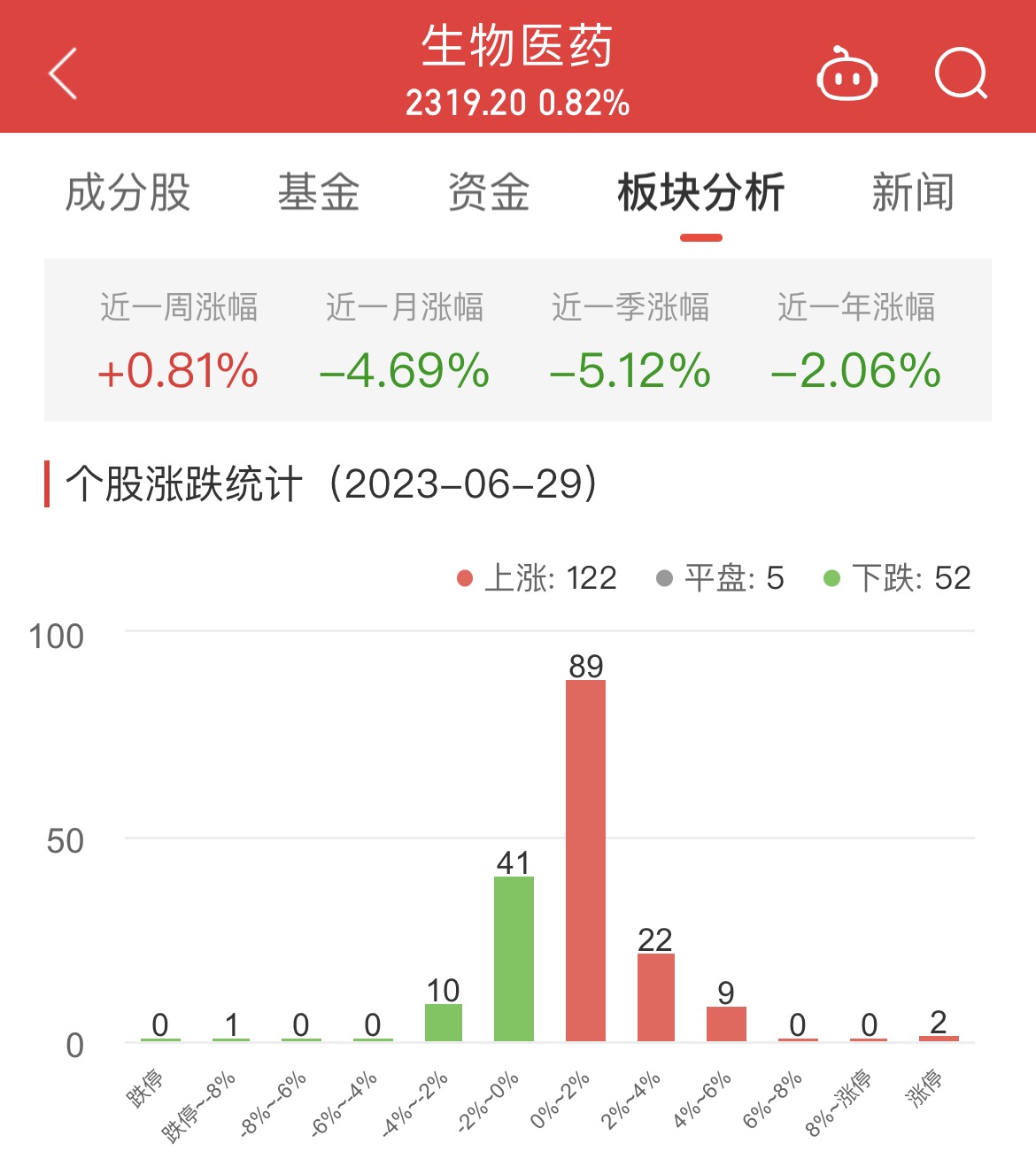 中国经济网北京6月29日讯今日,生物医药板块整体涨幅0.82%,其中122只股票上涨,5只股票平盘,52只股票下跌。