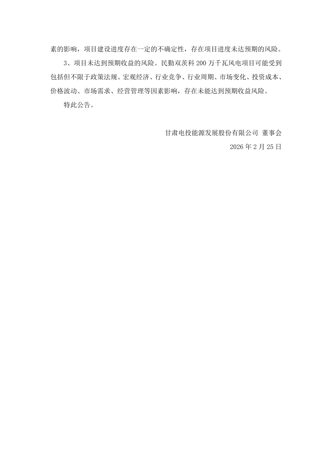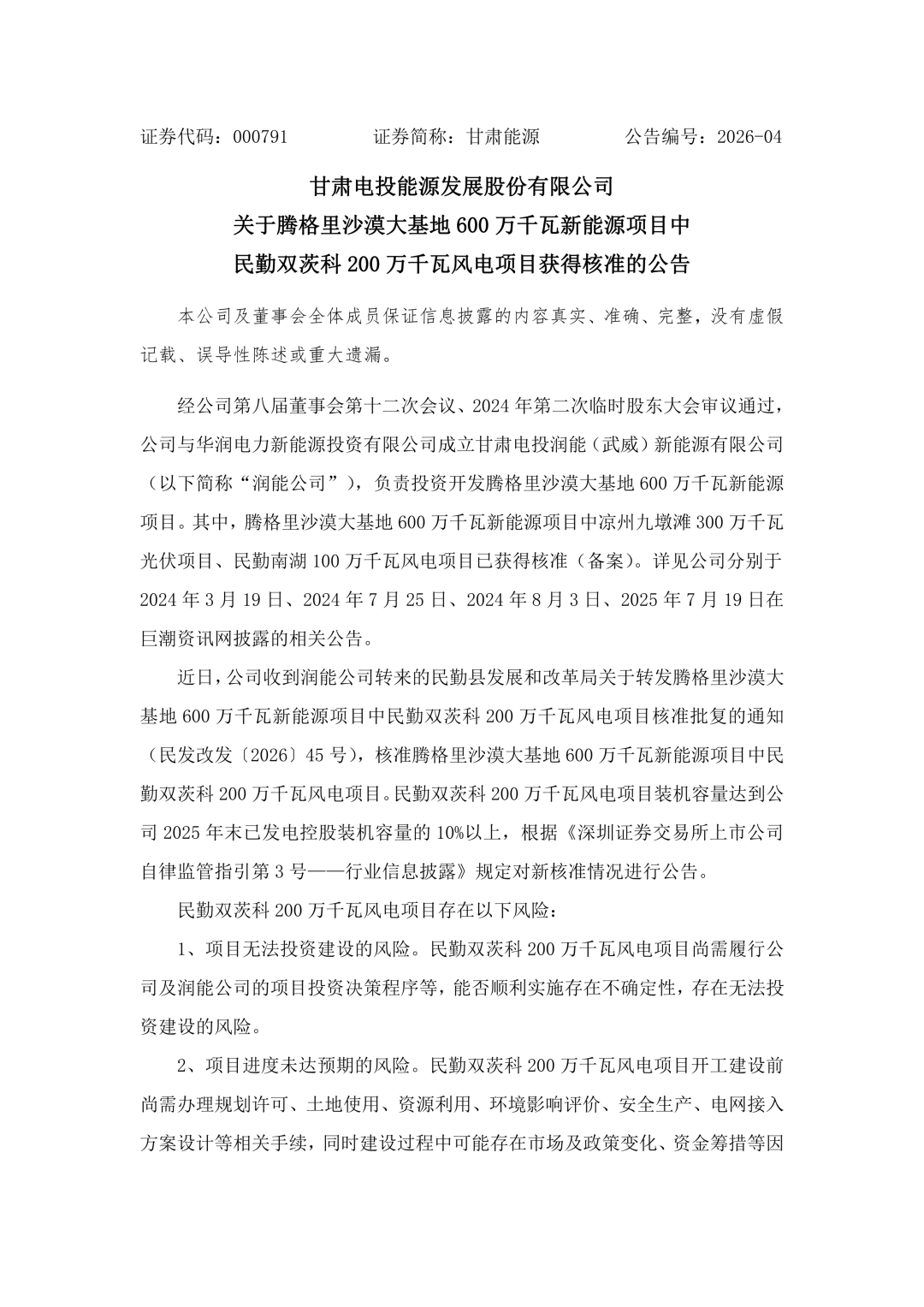 风芒能源获悉,甘肃电投能源发展股份有限公司(简称:甘肃能源)2月24日公告称,近日,公司收到润能公司转来的民勤县发展和改革局关于转发腾格里沙漠大基地600万千瓦新能源项目中民勤双茨科200万千瓦风电项目核准批复的通知,核准腾格里沙漠大基地600万千瓦新能源项目中民勤双茨科200万千瓦风电项目。