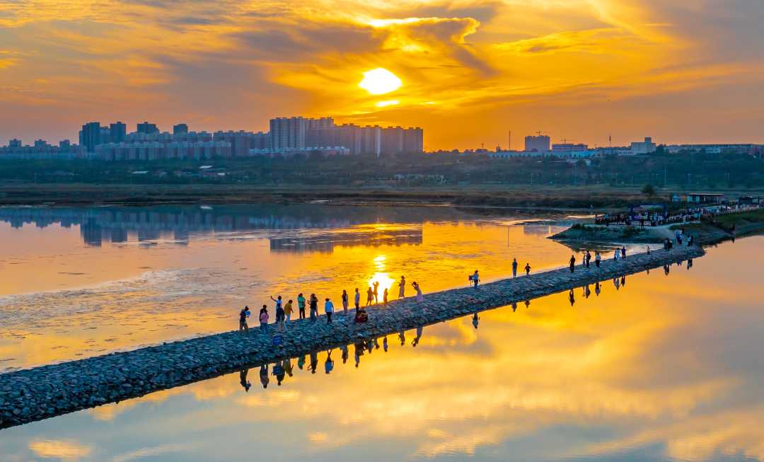 6月10日,游人在山西省运城市盐湖生态湿地游览,享受夏日休闲时光。