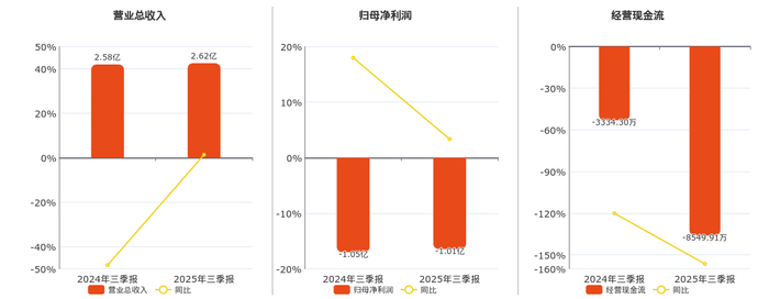 公司营业总收入为2.62亿元,较去年同报告期营业总收入增加340.25万元,同比较去年同期上涨1.32%。归母净利润为-1.01亿元,较去年同报告期归母净利润增加350.33万元,实现3年连续上涨。经营活动现金净流入为-8549.91万元。