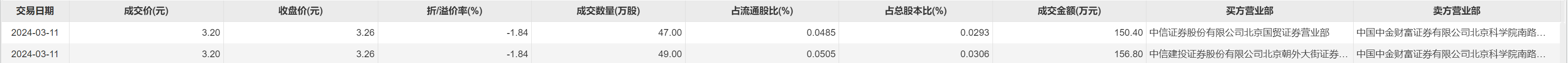 3月11日大宗交易成交96万股,成交额307.2万元,占当日总成交额的13.62%,成交价3.2元,较市场收盘价3.26元折价1.84%。
