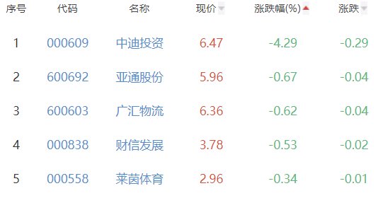 中迪投资、亚通股份、广汇物流、财信发展、莱茵体育位列板块涨幅榜后五位,涨幅分别为-4.29%、-0.67%、-0.62%、-0.53%、-0.34%。
