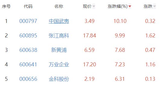 其中,中国武夷、张江高科、新黄浦、万业企业、金科股份位列板块涨幅榜前五位,涨幅分别为10.10%、9.99%、7.68%、7.23%、6.31%。