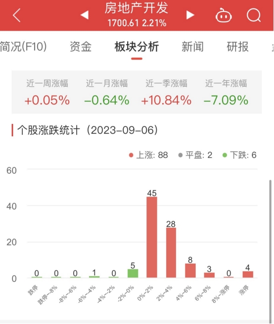 中国经济网北京9月6日讯今日,房地产开发板块整体涨幅2.21%,其中88只股票上涨,2只股票平盘,6只股票下跌。