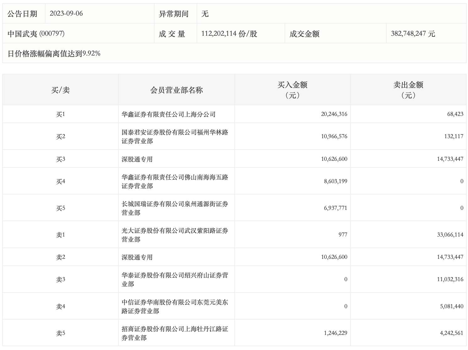 9月6日,中国武夷今日涨停,龙虎榜数据显示,上榜营业部席位全天成交1.27亿元,占当日总成交金额比例为33.18%。其中,买入金额为5862.77万元,卖出金额为6835.64万元,合计净卖出972.88万元。