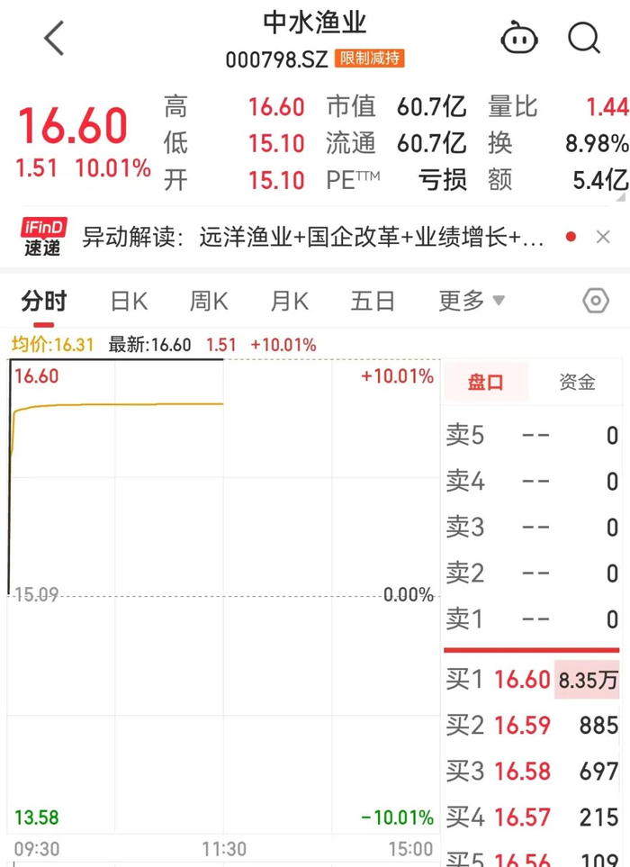 水产概念震荡反弹,开创国际、中水渔业(000798)双双涨停,国联水产、獐子岛、百洋股份等跟涨。中水渔业今日的股价开盘1分钟即涨停,公司在11月14日至11月21日期间,股票已经连续6个交易日收盘涨停。
