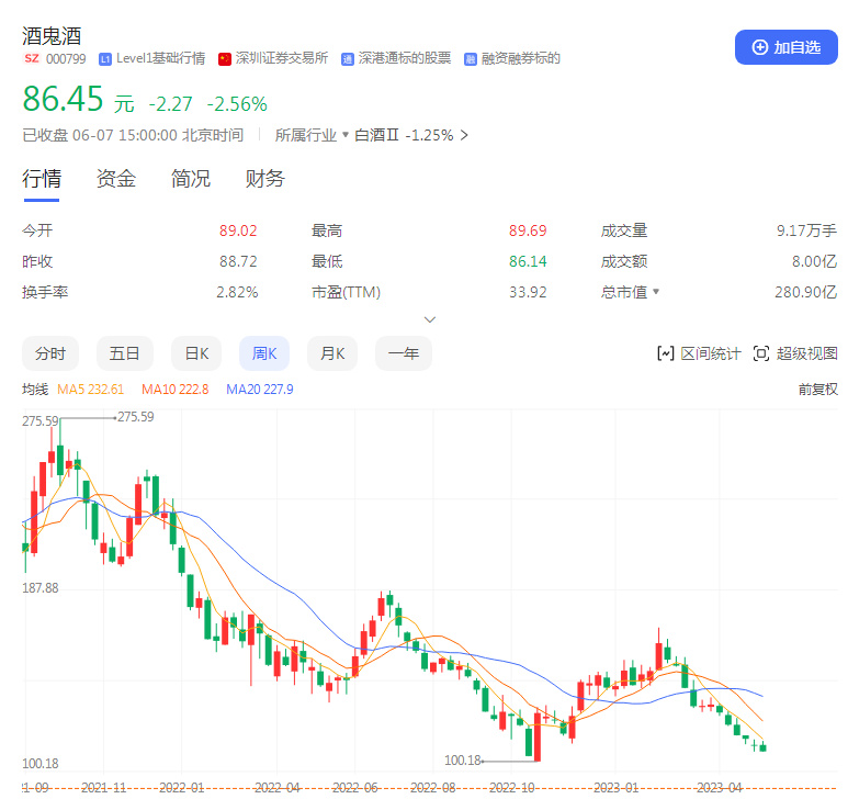 经历连续下跌之后,截至6月7日收盘,酒鬼酒的股价已经跌破90元/股的关口,收于86.45元/股。
