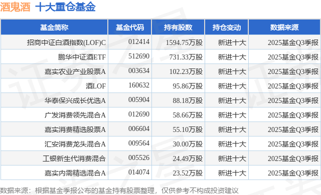 根据2025基金Q3季报公募基金重仓股数据,重仓该股的公募基金共17家,其中持有数量最多的公募基金为招商基金的招商中证白酒指数(LOF)C。招商中证白酒指数(LOF)C目前规模为150.16亿元,最新净值0.7652(11月7日),较上一交易日下跌0.31%,近一年下跌18.24%。该公募基金现任基金经理为侯昊。侯昊在任的基金产品包括:招商大宗商品(LOF),管理时间为2017年9月5日至今,期间收益率为66.47%;招商中证银行指数A,管理时间为2017年9月5日至今,期间收益率为80.65%;招商深证100指数A,管理时间为2017年9月5日至今,期间收益率为71.82%;招商央视财经50指数A,管理时间为2017年9月5日至今,期间收益率为79.29%。