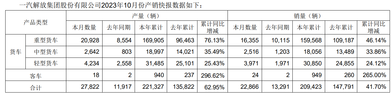 一汽解放:前10月销量约20.94万辆,同比增长41.7%
