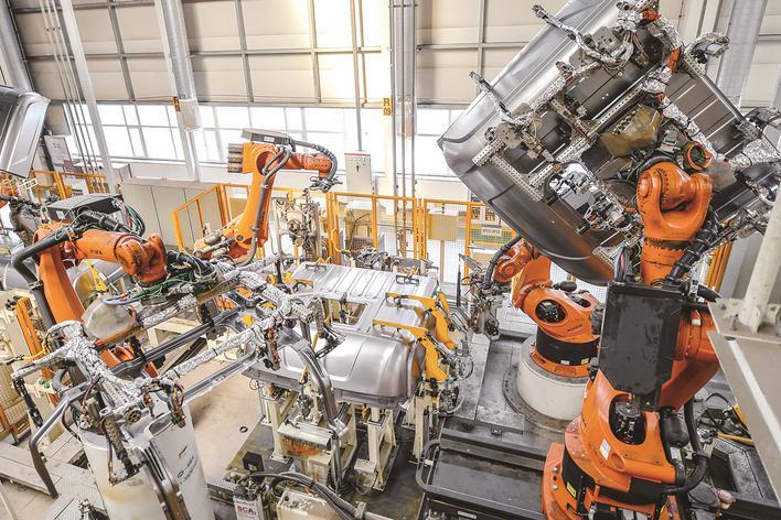 2月7日,在位于吉林长春的一汽解放汽车有限公司卡车厂焊装车间内,流水线上的机器人对零部件进行焊接作业。