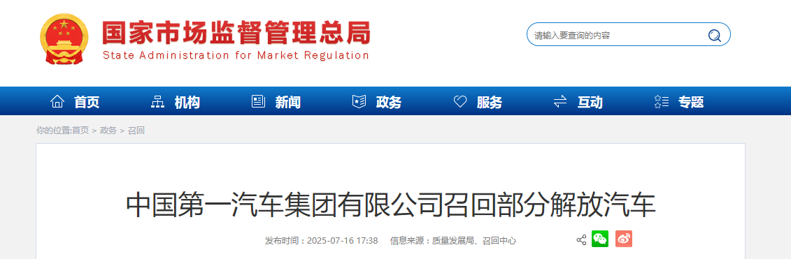 日前,中国第一汽车集团有限公司根据《缺陷汽车产品召回管理条例》和《缺陷汽车产品召回管理条例实施办法》的要求,向国家市场监督管理总局备案了召回计划。