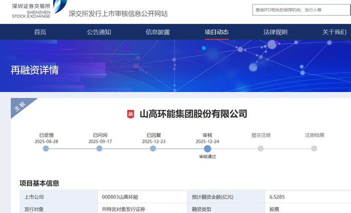 中国经济网北京12月25日讯 山高环能(000803.SZ)向特定对象发行证券事项昨日获得深交所审核通过。