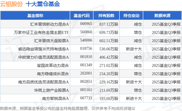 重仓云铝股份的前十大公募基金请见下表: