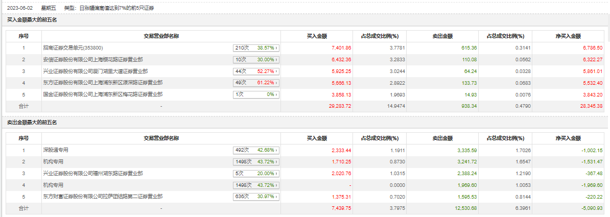 6月2日,创维数字今日涨停,龙虎榜数据显示,上榜营业部席位全天成交5.02亿元,占当日总成交金额比例为25.62%。其中,买入金额为3.67亿元,卖出金额为1.35亿元,合计净买入2.33亿元。