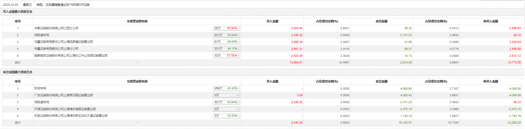12月20日,创维数字今日涨停,全天换手率达6.85%,振幅达4.77%。龙虎榜数据显示,营业部席位合计净卖出1587.87万元。其中,机构合计净卖出4088.6万元。此外,华泰证券江西分公司、深股通专用分别买入2904.94万元、2839.42万元;广发证券上海秀沿路证券营业部、深股通专用分别卖出4060.43万元、2741.2万元。